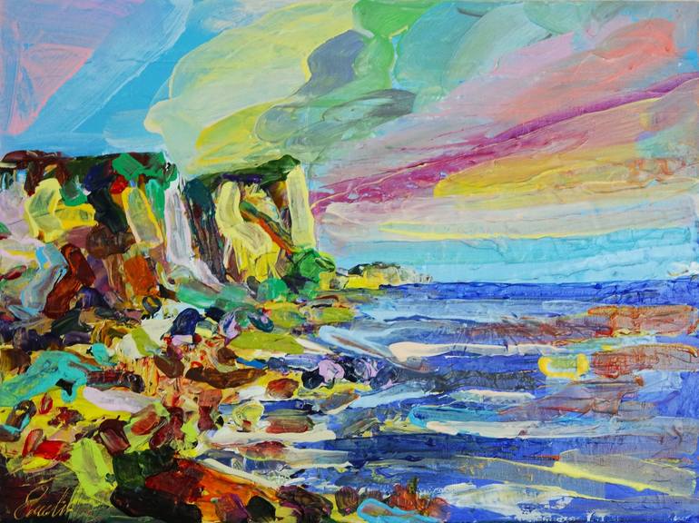 Abstract Colourful Yummy Beach 5108 12 x 16 x 1.5 inches (30 x 40 x 4 cm) Acrylic on Stretched 3D Box Canvas. Big beautiful, and brightly coloured painting with oranges, reds and pinks and yellows pastels and intense colours. All shadows and abstraction have been removed, so only pure textured bold...