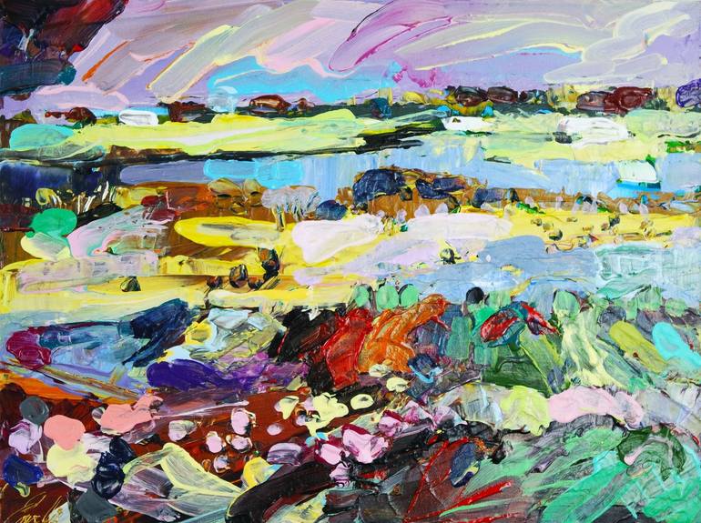 Abstract Colourful Yummy Landscape 5113 12 x 16 x 1.5 inches (30 x 40 x 4 cm) Acrylic on Stretched 3D Box Canvas. Big beautiful, and brightly coloured painting with oranges, reds and pinks and yellows pastels and intense colours. All shadows and abstraction have been removed, so only pure textured ...