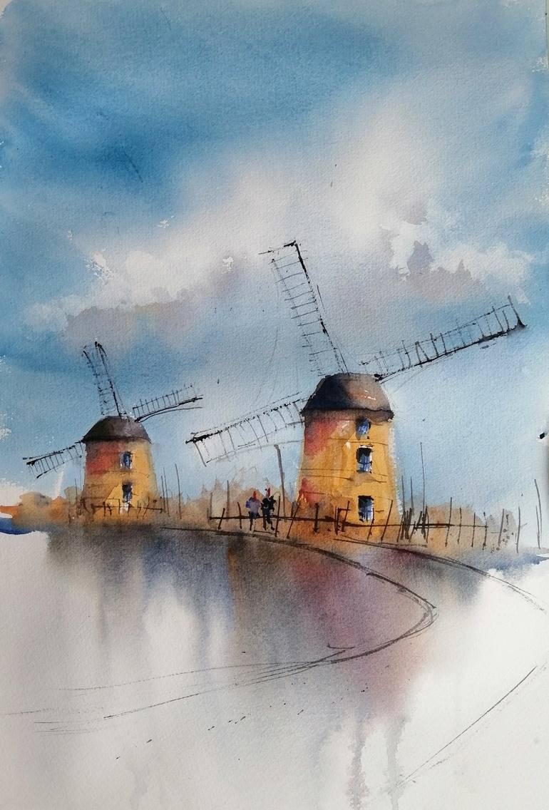 some windmills for this landscape watercolor. This artwork is done on 300 g Fabriano Artistico watercolor paper with Winsor&Newton colors. Signed on the front, the Certificate of Authenticity is included. Please don't hesitate to get in touch with me if you have any questions about this artwork.