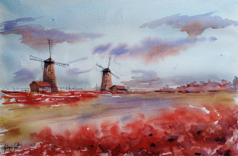some windmills for this landscape watercolor. This artwork is done on 300 g Fabriano Artistico watercolor paper with Winsor&Newton colors. Signed on the front, the Certificate of Authenticity is included. Please don't hesitate to get in touch with me if you have any questions about this artwork.