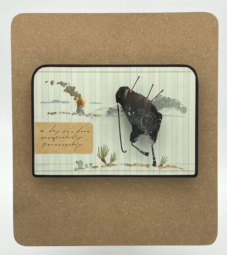 I make pictures of situations that I want to think about and look at. My pictures have carved wood figures with wire appendages that are mounted over drawings on paper. I am inspired by the natural history museum dioramas and display cases I spent time in front of in my early years and that I continue to find and absorb. My figures are people-animal-shape configurations, and the drawings have landscape elements with plant shapes added in to charm my wife. Born 1969 in Alabama, raised in Nebraska, now living in Oregon, USA. Received a Bachelor of Fine Arts from the University of Nebraska-Lincoln and was represented by Lorinda Knight Gallery in Spokane, Washington, and by Augen Gallery in Portland, Oregon. Work in the collection of the Missoula Art Museum.