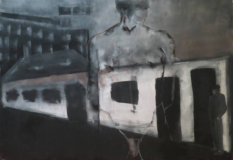 A man is standing in front of a building. Naked, directed to the viewer. A second man leans in front of the house. Is he the naked man, the alter ego, the other me?
