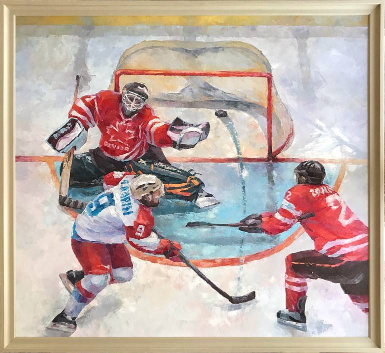 Одна из серии работ художника из России на тематику спорта. На картине запечатлен живой момент игры в хоккей. Художник работал над этой картиной около года, старался передать все эмоции и напряжение от волнующего момента игры в ворота. Вся серия картин посвящена волнующим моментам спортивных состяза...