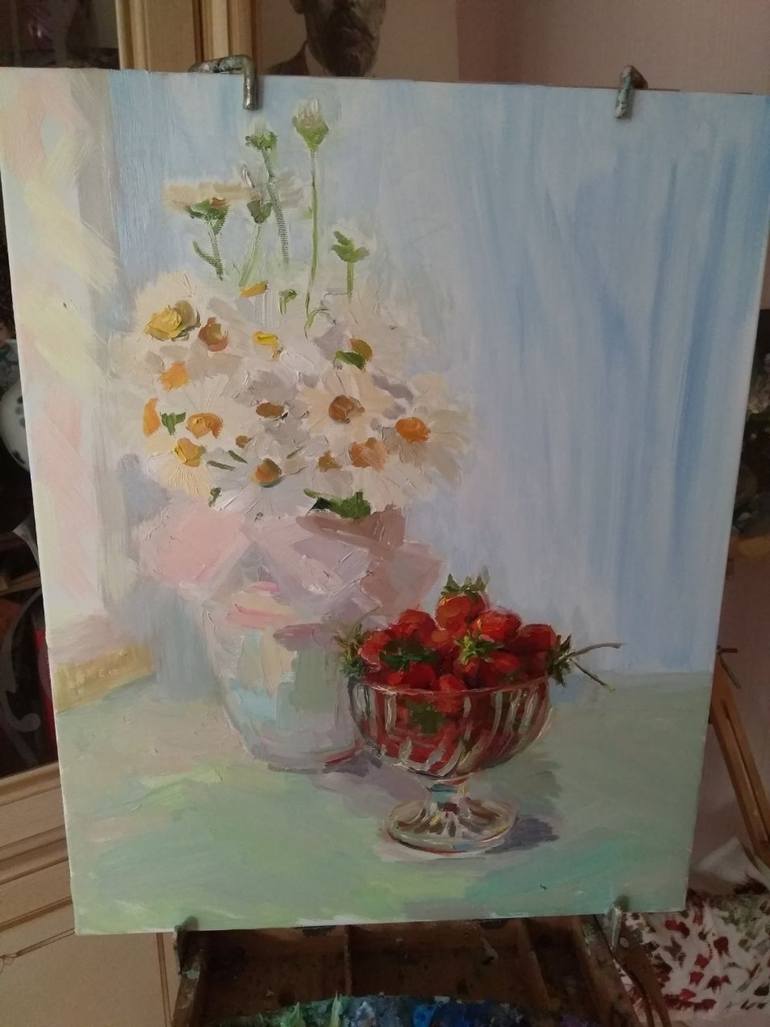 Яркий и вместе с тем нежный натюрморт с ромашками и первой весенней ароматной клубникой.