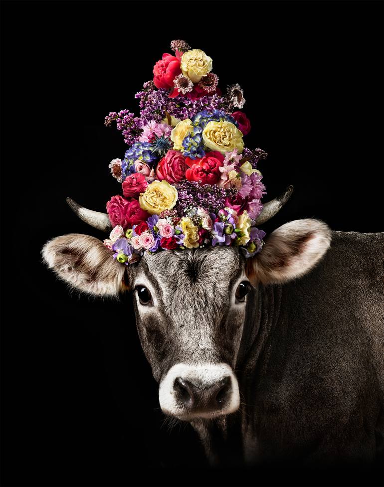 In a stable surrounded by darkness, a breathtaking sight unfolds. Flower-crowned farm animals are captured in a style reminiscent of the great master Rembrandt. Cows, sheep, and goats pose against the black backdrop, their forms illuminated by a soft light. The delicate petals of s daisies, roses, ...