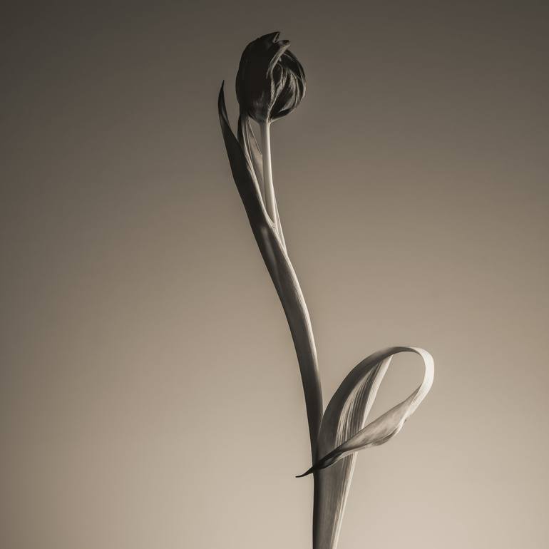 The monochromatic color palette (sepia tone) and the clean background enhance this artistic and graceful feel. The lighting and the way the stem curves subtly suggest movement and elegance. Printed on Hahnemühle Fine Art Baryta Limited edition of 20 Signed and numbered. Comes with a certificate of a...