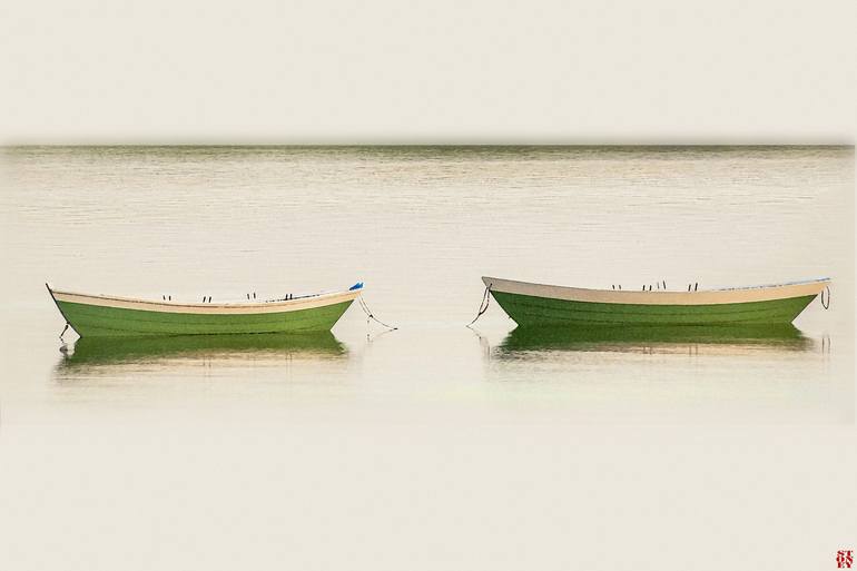 An image of 2 dories at anchor near Eagle Hill in Ipswich, MA. Original printed on acid-free handmade paper use Epson Pigment Inks. Image size is 16x24 centered on a sheet of approx 19 x 29 paper. The nature of the handmade paper makes every print unique.