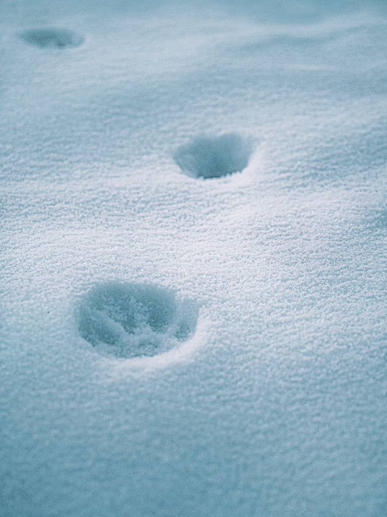Photo of cat paw prints on blue snow, snow texture, minimalistic style and light pastel colors