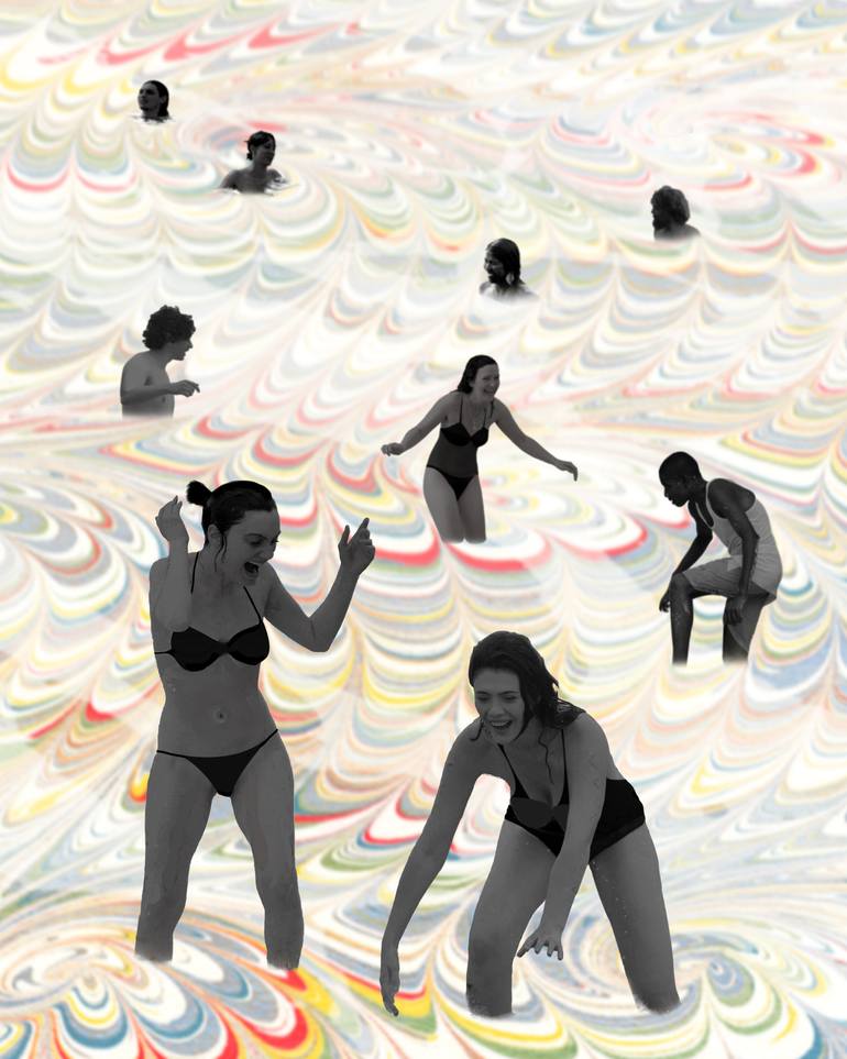 A companion piece to "A Day at the Beach'. Part of a series that explores background versus foreground, op-art and how much the eye can know from the body language in a silhouette. The work starts with antique marbled paper which is photographed. Then the silhouettes are created and added to the...