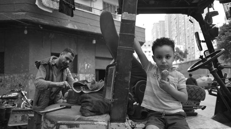 In the bustling heart of Shoubra, Cairo, this photo captures a tender moment between Hussein, a hardworking laborer , and his son. Hussein carries his son with him, not just for work, but to nurture a bond and inspire him to follow in his footsteps. The scene embodies the dedication father have t...