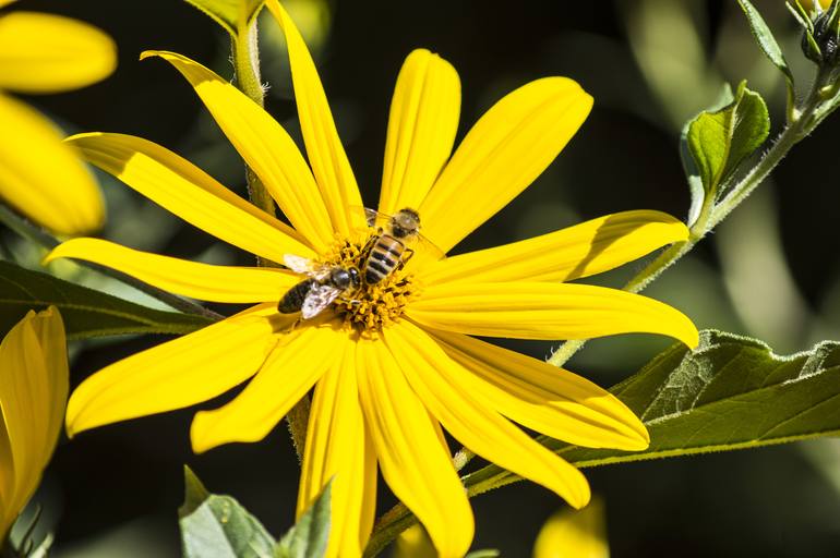A Yellow Flower with two Bees on it during the Summer Time in August 2016.