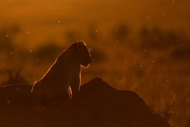 A lone lion cub, barely larger than a sunbaked melon, perches atop a moss-covered tor, its tawny fur blending seamlessly with the golden hues of dusk. The last embers of the sun splatter the sky in molten oranges and purples, casting long, jagged shadows across the rippling savanna. In the distance,...