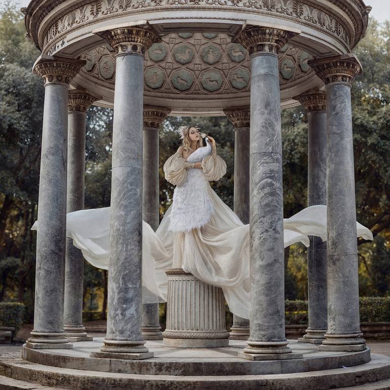 This is one of the photos from the "Birds" collection. Limited edition Magnum Opus. Amidst the allure of Rome, this photograph encapsulates an ethereal scene. A girl, draped in a levitating white dress, delicately cradles a rare albino peacock in her hands, creating a mesmerizing moment of enchantm...