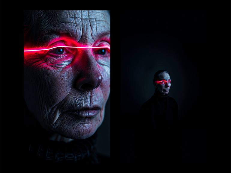 AWARNESS from “Binary Sentiments” collection. This photography collection showcases the fusion of human sentiment and digital advancement, featuring us in a futuristic landscape. The images are illuminated by neon lights and surrounded by coded bubbles, capturing a spectrum of emotions that challeng...