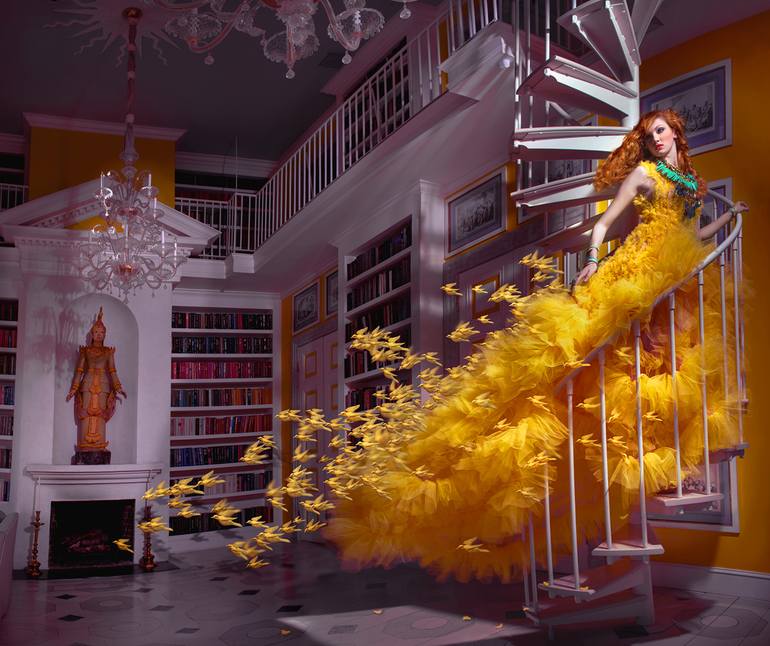 All-time bestseller, 'Away with the Canaries', Saatchi Gallery-exhibited! Sold out in almost 5 sizes. *ONLY 1 ARTIST'S PROOF REMAINS* in this Special Satin edition, 75 x 89cm (25.5 x 35"), limited to 7 + 2AP. No AI used. "Annabelle’s dress, which already seemed to breathe the life of yellow birds t...