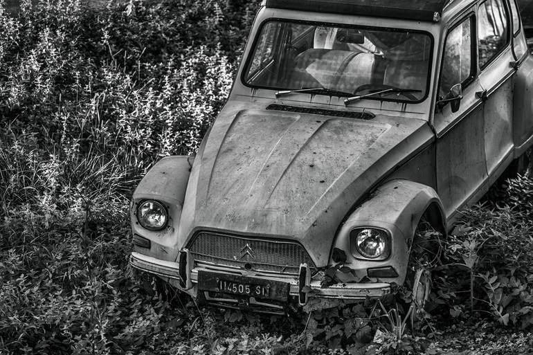 A fine art Gicleé print of an abandoned French classic car, 1967-1983 Citroen Dyane in Tuscany, Italy. Image size 90x60 cm (35.4x23.6") including 5 cm (2") white border for easier framing. Actual size 80x50 cm (31,5x19,7"). Smaller prints are available in an open edition. The fine art Giclée prin...