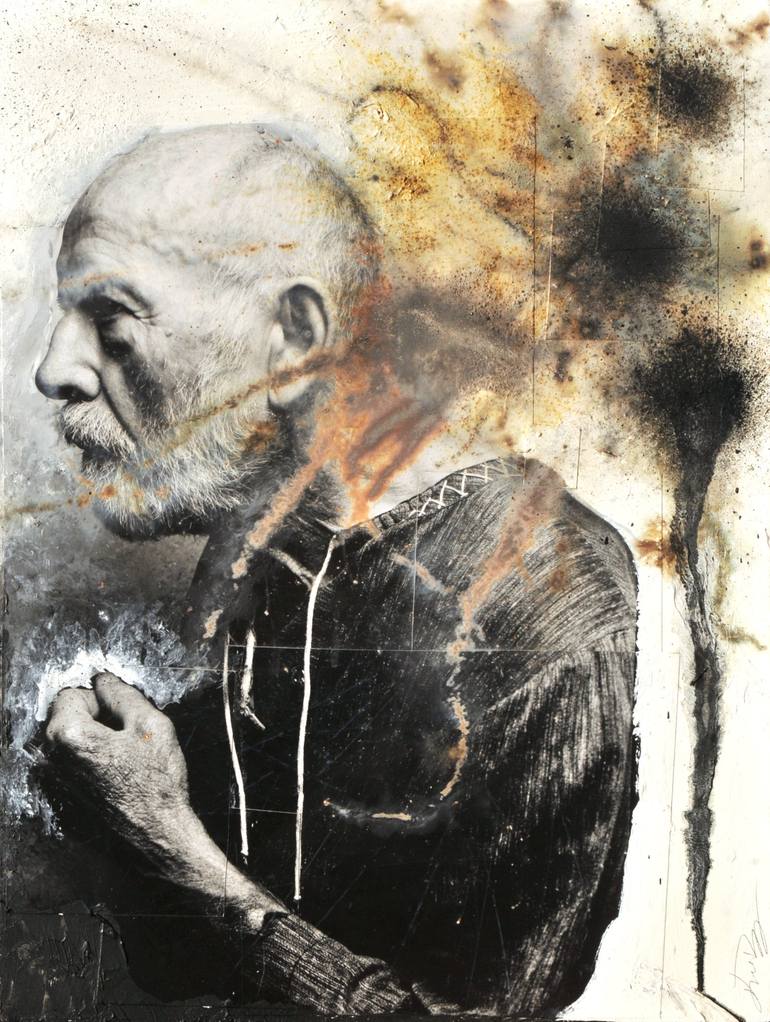Mixed Media: black and white photograph montage with acrylic, graphite and gunpowder burns on wooden panel // 18x24 For Israel. The textures were created by igniting gunpowder on the surface of the panel and burning into the print itself. It’s an uncontrollable process and the explosion chooses i...