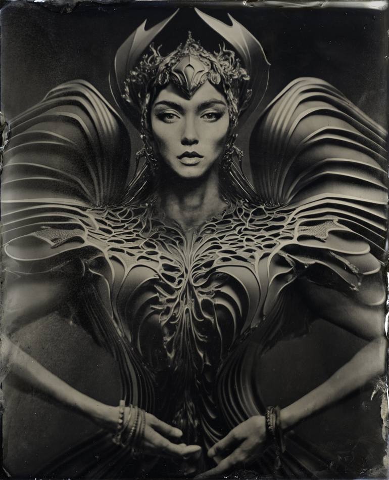This work is one of a series "Legendary Characters" of mystical, meditative artistic images. This image is made using 19th century authentic wet plate collodion technology with 8x10 inches camera on blackened silver plates. Pure sculptural beauty of women frozen with long exposures arise to antique ...