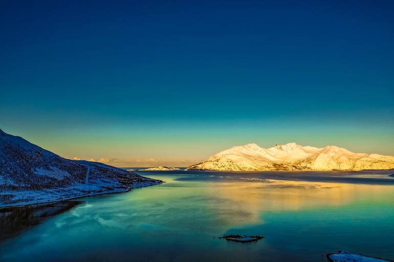 Capture the breathtaking beauty of Scandinavia with this stunning aerial photograph of Norwegian fjords. The artwork, a C-type photogram, showcases the landscape of Northern Norway on a sunny early Spring day. The colour photo, printed on paper, captures the essence of the natural world. The artist...