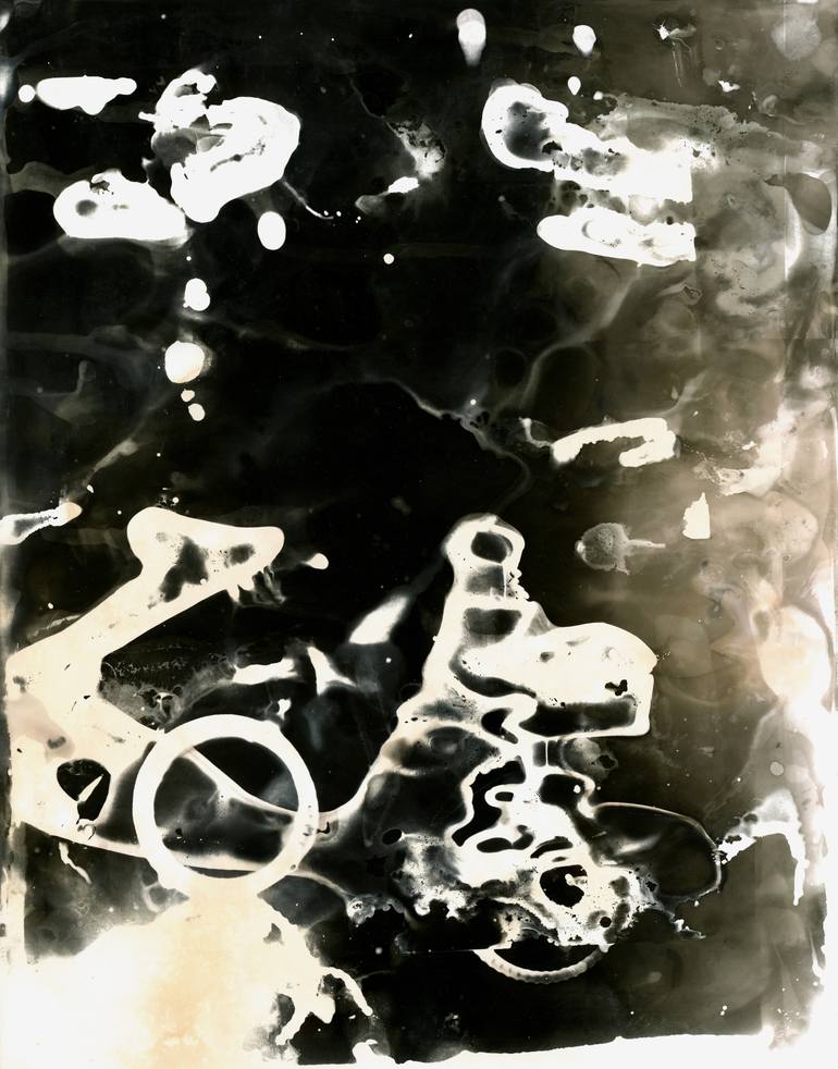 Black and white Alchemigram on Baryth gelatin photographic paper. An Alchemigram is a mixture of the analogue techniques of photogram, lumigram and chemigram. This one is made by carefully applying photographical and other chemical substances ( such as e.g. toilet-cleaner) on the photographic surfac...