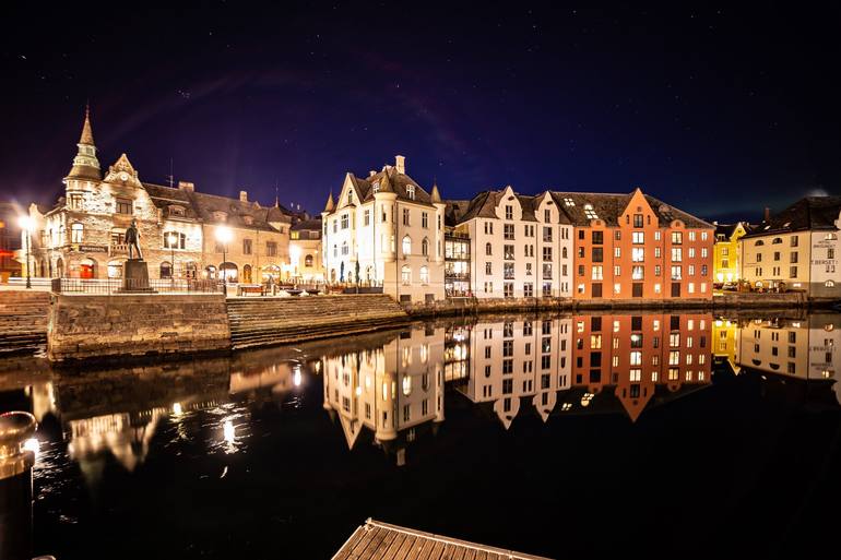 Famous place in Norway City of Ålesund old town at night Norway Scandinavia Northern Europe PRINTED on high-quality photographic paper