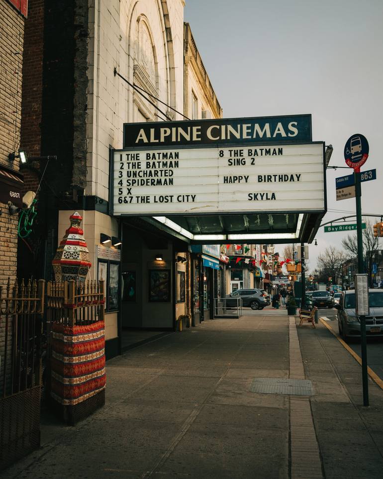Alpine Cinema vintage sign in Bay Ridge, Brooklyn, New York - digital photographic print by travel photographer Jon Bilous