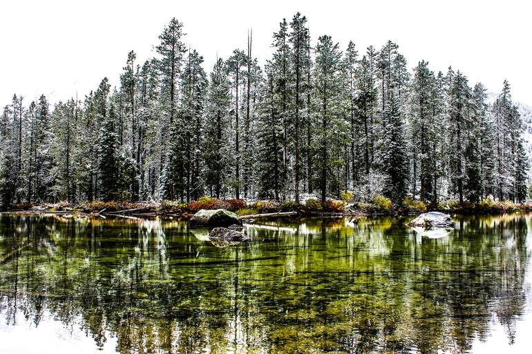 Grand Teton National Park, Wyoming along Leigh lake. It was one of the first snows in early October of 2017. Along this string of lakes was a view across the crystal clear alpine water where you could see the snow covered trees disappear into the white of the sky. All that remained was the fine deta...