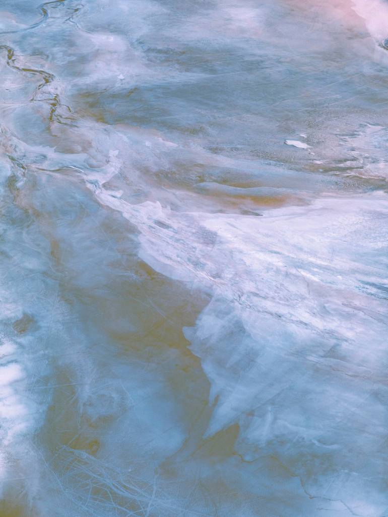 'Amadeus Rising' is an abstracted dreamscape of a salt lake. This artwork has a cool palette of frothy blues with painterly textures that resonate to expose the beauty and romance of this rugged Australian landscape from an aerial perspective.
