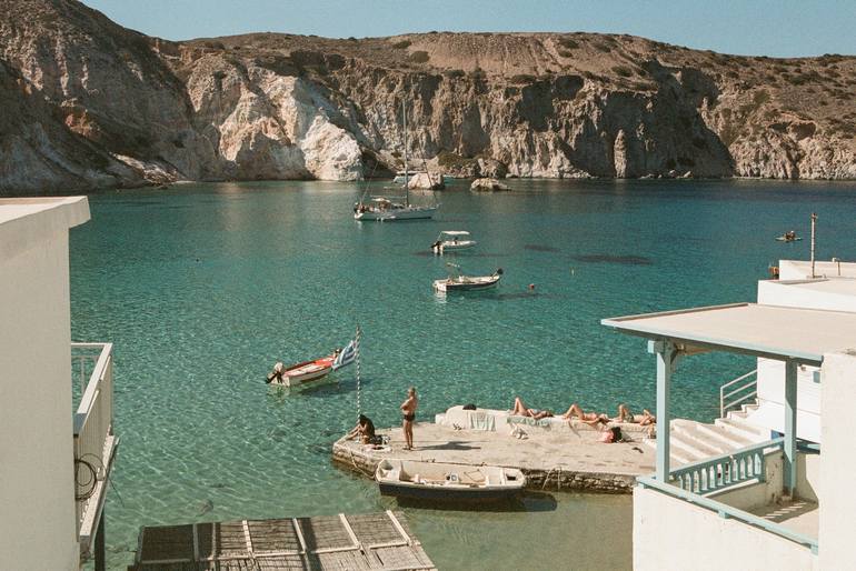 Amarine captures a moment of pure coastal bliss — sunbathers stretched out on a humble stone dock, boats bobbing gently in crystalline turquoise water. The surrounding cliffs embrace the bay like a natural amphitheater, quiet and sun-soaked, amplifying the sense of ease and contentment. Everything h...