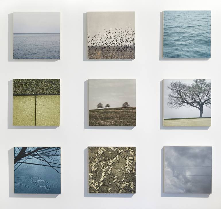 Grid of 9 photographs mounted on 1.75 inch wood block coated with slightly glossy medium- ready to hang.