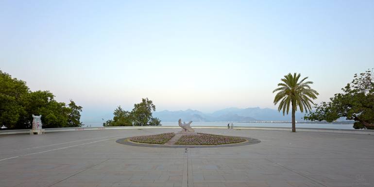 Antalya XII. Photo © 2011 from the series Views of Antalya. Square in the Karaaglioglu park in the early morning, in the middle the monument for Hasim Iscan (*1898 - +11.3.1968), mayor of Antalya 1940 - 1945. Behind the bay of Antalya. Antalya, Turkey. Print on Hahnemuhle Photo Rag 308g matt paper...