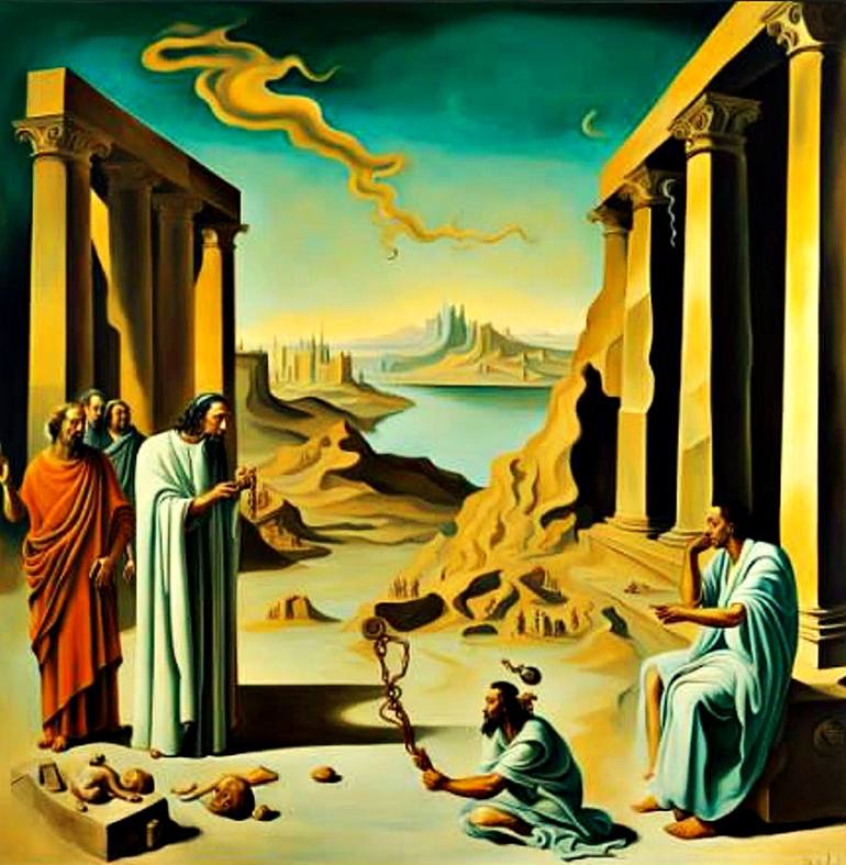 The A.I. created interpretation from my description of a group of classical figures stands within a surreal, architectural landscape with sand-strewn floors and an expanse of water in the distance. The figure of Ascelpius seems to be addressing another who sits on steps, while a third kneels with br...