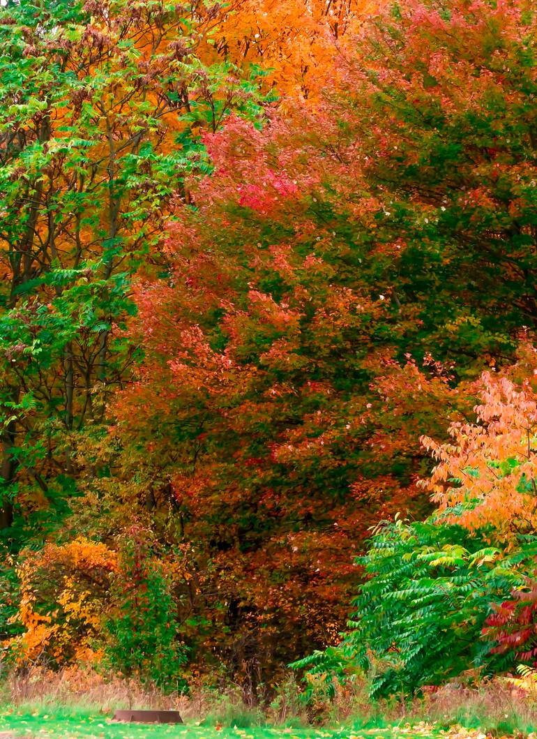 Vibrant rich Autumn fall colors on a cluster of trees on a calm cool day