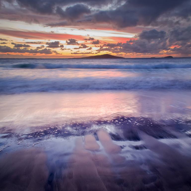 As the sun sets over the small island of Pabbay the wet sand runs with rivulets of the outgoing tide. Dark plum tones run through the sand and water creating a deep colour contrasted by a bright sky. Made on a gentle evening at a small beach on the Isle of Harris when the waves were gently swaying i...