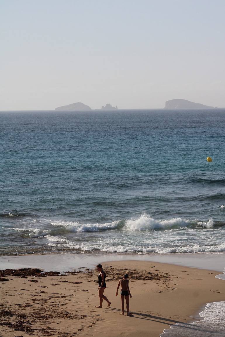 The beautiful Cala Comte on a glorious November day, warm weather for people to swim in the sea and sunbathe until the sun sets. Love the shadows and waves.