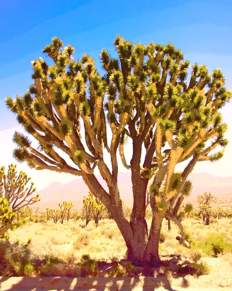 A cluster of Joshua trees against a painted desert sky in various shades of blue, creating somewhat of a monochromatic rainbow effect. Photographed on location in Joshua Tree National Park by William Dey. Image is printed on crisp white matte Picture Rag museum-quality paper and measures 16"W X 20...
