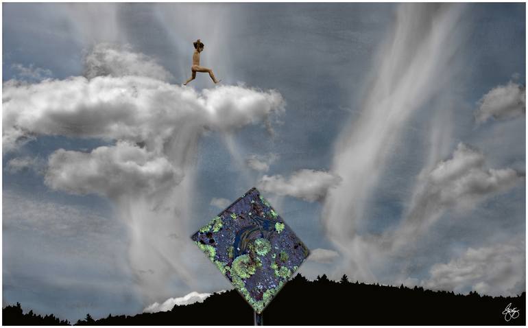 The third in a series of images entitled Finding Your Own Path. This image depicts a nude male leaping between clouds over a lichen encrusted sign. Only one original edition of 5 prints of this image is created, signed, dated and with a certificate of authenticity Printed on fine art paper with arch...