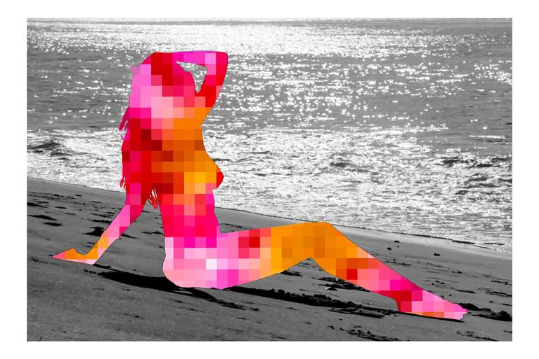 "Beach, Bytes, and Beauty" merges traditional photography with digital artistry. This artwork features a silhouette of a woman with an hourglass body shape, sitting and leaning back on her hands, with her hair being blown in the wind at the beach. The black and white photograph of the beach and ocea...