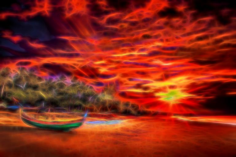 This captivating photograph captures the mesmerizing beauty of a tropical beach at sunset. A lone boat rests on the sandy shore, its colors subtly mirroring the vibrant hues of the sky. The dramatic sky is ablaze with a spectrum of fiery reds, oranges, and purples, creating a stunning backdrop that ...
