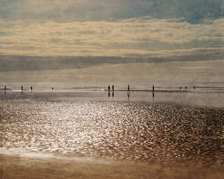 Silhouettes of bathers on the beach. Limited Edition Giclee Printed and signed by the artist (Edition of 25). Unframed on 315 gsm Smooth Fine Art archival Paper with 3 coats of satin varnish applied with a brush to create a painterly finish.