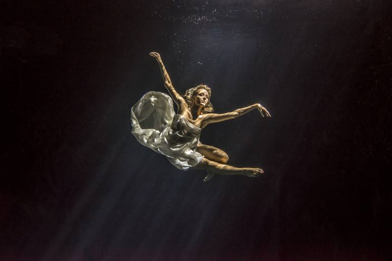 A study in black and white. A woman poses underwater weightlessly in a white dress. This piece is currently offered in 24 x 16.02 inches. Printed on fine art Hahnemuhle archival quality 350 gsm, 100% cellulose, acid free, pearl fibre based photographic paper. Using Epson Ultrachrome K3 pigment b...