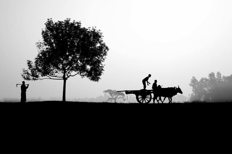 At the beginning of the day. At the end of the night, at the beginning of the day, in the winter morning, the people of the village are rushing to their workplaces. Traditional cow cart, bicycle or someone walking to work. 90% of the people here are involved in agriculture. Picture taken from a vil...