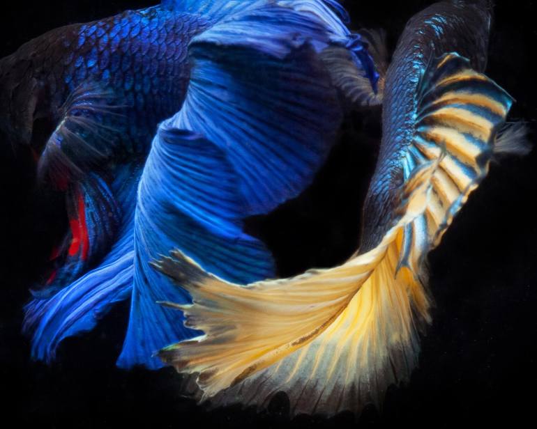 Color Photograph of 2 Beta Fish Swimming on Black. Printed on Archival Fine Art Paper