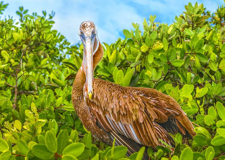 Brown big pelican at top of leafy tree at Galapagos Islands, Ecuador