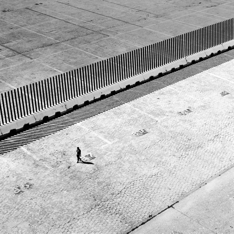 Cadiz, Spain Standing on the top deck of a cruise ship, I was taken by this tiny figure surrounded by the all the different lines on the concrete and the fence.