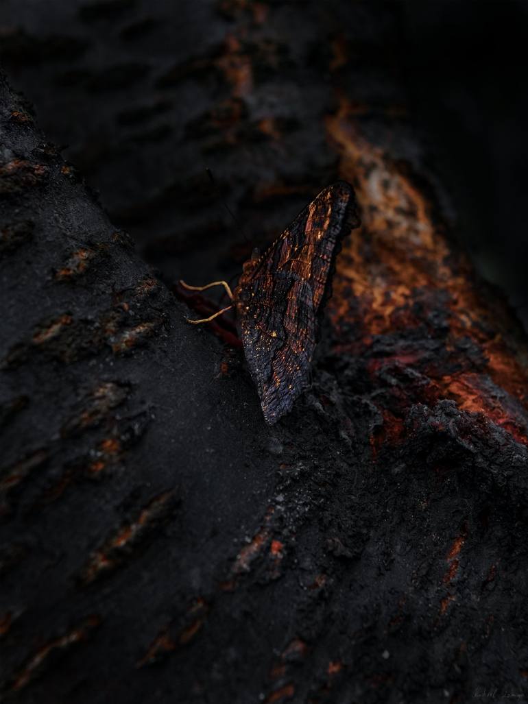 The photo is high resolution and with good detail so the print will be of high quality. Dark painting with accents on orange colors and textures, Butterfly on a tree. The orange hues on the wings of this insect add to the magic of this picture and the orange tree trunk bare of bark reminds me of la...