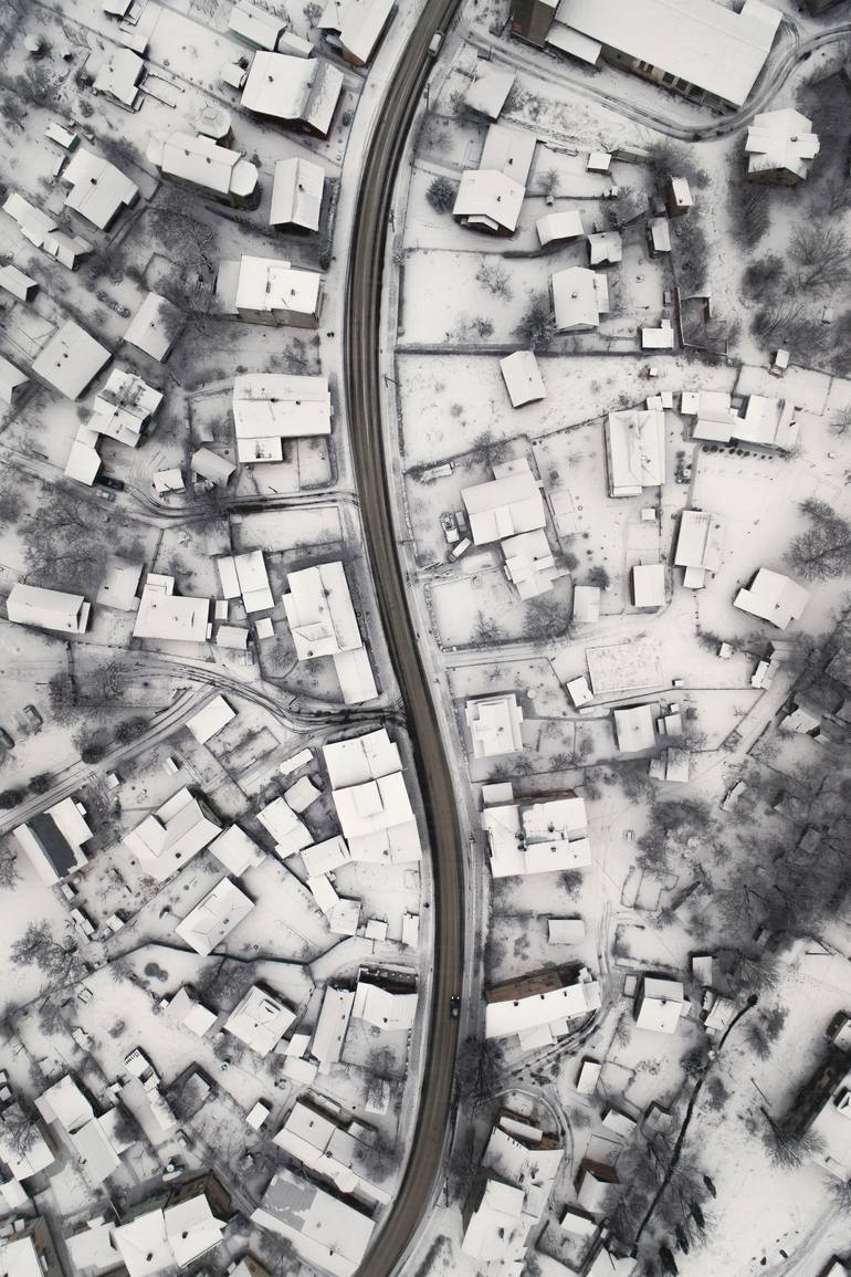 Bird-eye snowy wintrer view of a small Carpathian city.