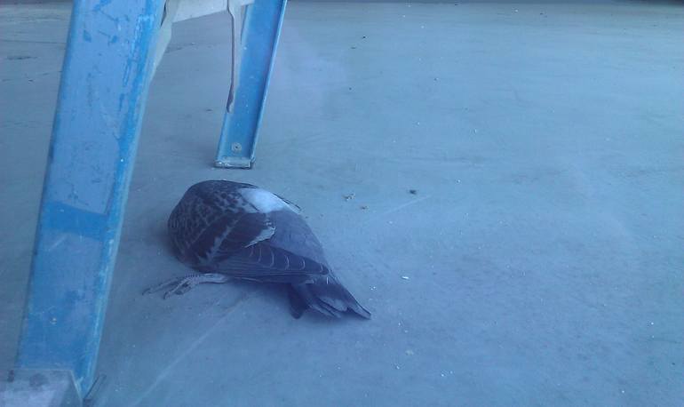 Found in an industrial building, the color suited the mood of the sad demise of this pidgeon who Im guessing hit the large glass window we're seeing him through...