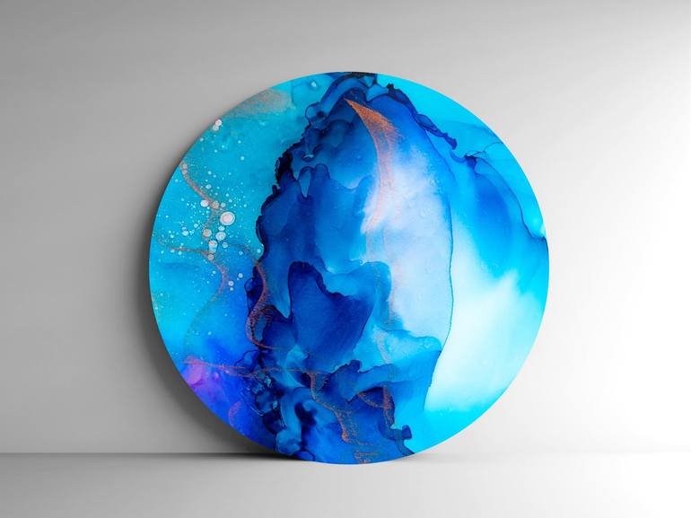 Blue Waves is a limited edition print of an original painting made in alcohol inks. The intense colours and gold highlights are enhanced under an acrylic glass coating. The print is made on metallic paper and is then mounted on a dibond steel sheet for rigidity before being covered with high gloss a...