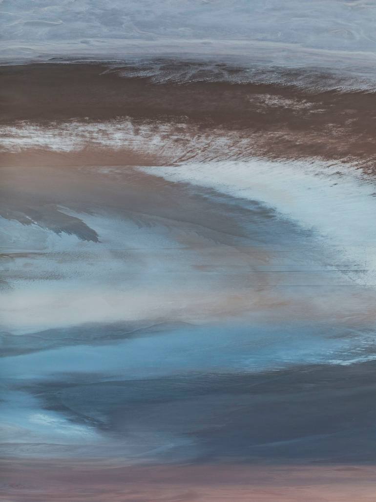 'Blue Yonder' is an abstracted dreamscape of a salt lake. This artwork has a cool palette of blue and dusty pink with chalky textures that resonate to expose the beauty and romance of this rugged Australian landscape from an aerial perspective.